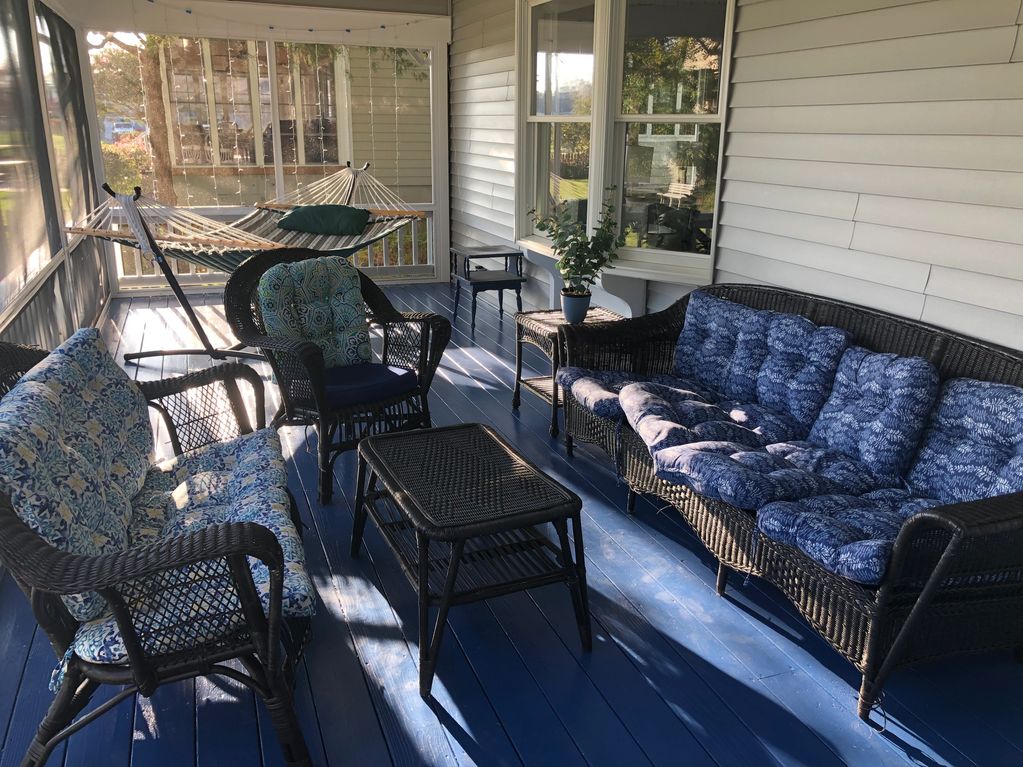 Enjoy a fresh bay breeze in this spacious 5-bedroom home located 2.5 blocks from the beach, in a secluded, quiet neighborhood and across the street from the bay (and shared boat launch) . Water views from several rooms and a huge 40’x10’ screened in front porch with seating, a hammock and a large picnic table.